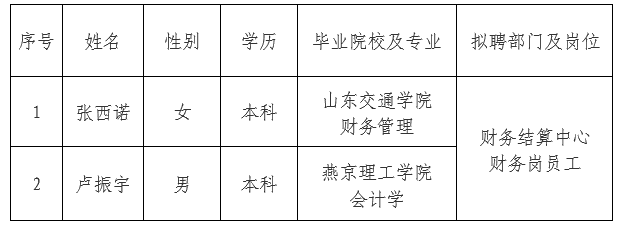依據(jù)出資人代表機構(gòu)審批意見,承德市國控投資集團(tuán)有限責(zé)任公司委托第三方機構(gòu)面向社會公開招聘財務(wù)崗員工2人?,F(xiàn)對擬錄用人員信息進(jìn)行公示,公示期間如有異議,可通過電話、信函等方式反映,反映意見請署真實姓名。