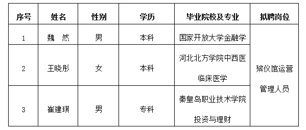 因公司發(fā)展需要,承德市國瑞置業(yè)有限公司委托第三方機構(gòu)面向社會公開招聘殯儀館運營管理人員3名?,F(xiàn)對擬錄用人員信息進行公示,公示期間如有異議,可通過電話、信函等方式反映,反映意見請署真實姓名。