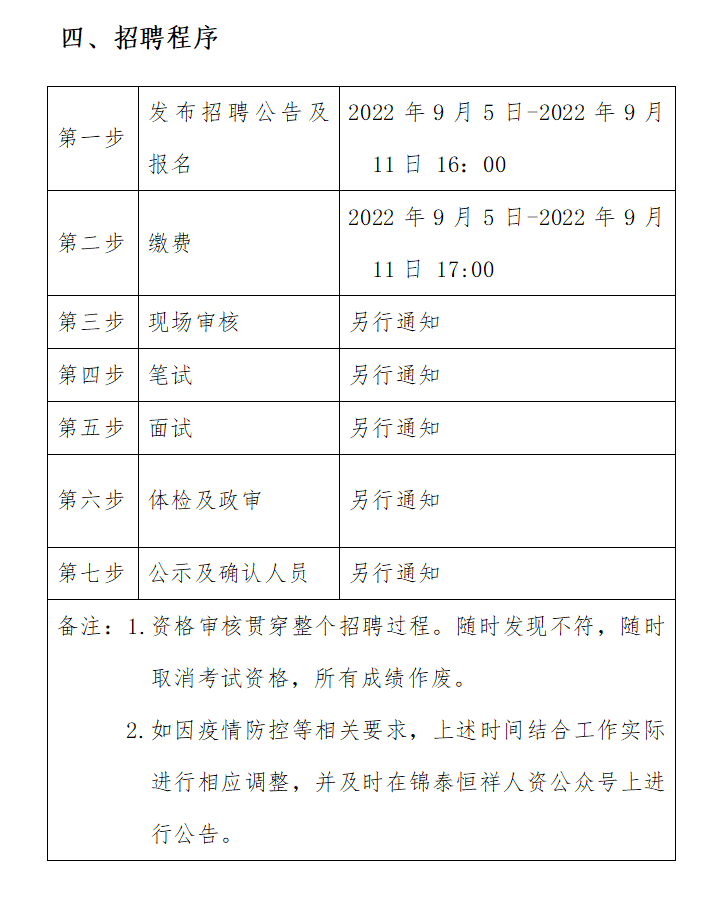 ?2022年9月5日-2022年9月11日16:00 在錦泰恒祥人資官網(wǎng)(www.jthxhr.com)、“錦泰恒祥人力資源服務(wù)有限公司”微信公眾號(hào)、“國控集團(tuán)”官方網(wǎng)站(m.lukchantech.com)及上級(jí)部門要求的相關(guān)網(wǎng)站等發(fā)布招聘公告。