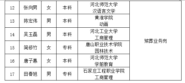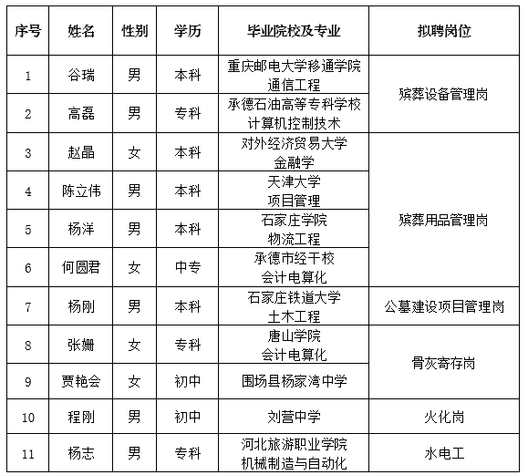 因公司發(fā)展需要,承德市國瑞置業(yè)有限公司委托第三方機(jī)構(gòu)面向社會(huì)公開招聘殯儀館運(yùn)營各崗位人員17名?,F(xiàn)對(duì)擬錄用人員信息進(jìn)行公示,公示期間如有異議,可通過電話、信函等方式反映,反映意見請(qǐng)署真實(shí)姓名。