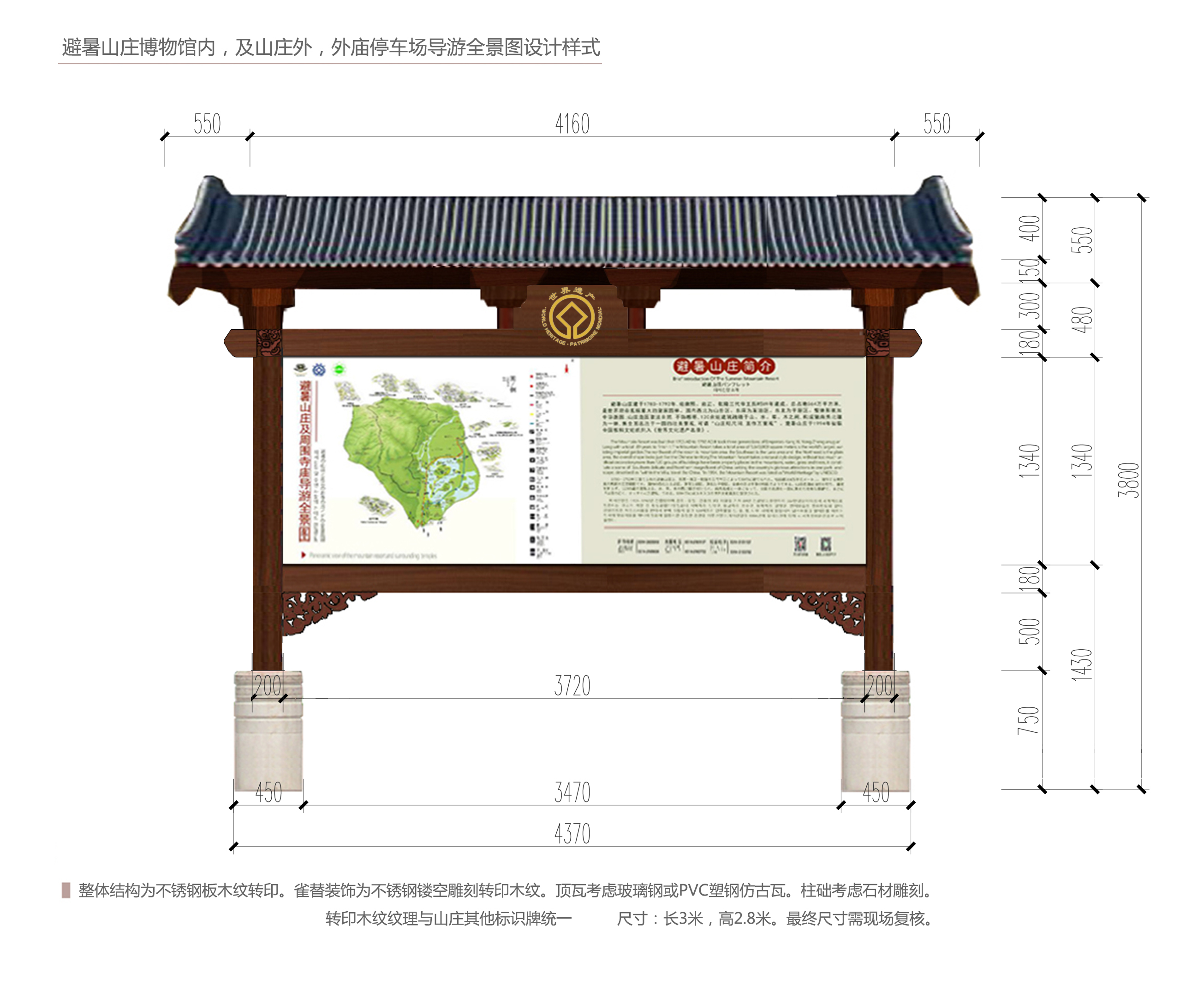 按照承德市人民政府辦公室印發(fā)的《避暑山莊及周圍寺廟景區(qū)整改提升專項工作方案》要求,在避暑山莊及周圍寺廟外5個停車場內(nèi),各設(shè)置景區(qū)導(dǎo)游全景圖1塊,由我公司邀請有資質(zhì)的單位進(jìn)行制作和施工,現(xiàn)將有關(guān)事項通知如下: